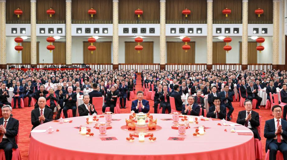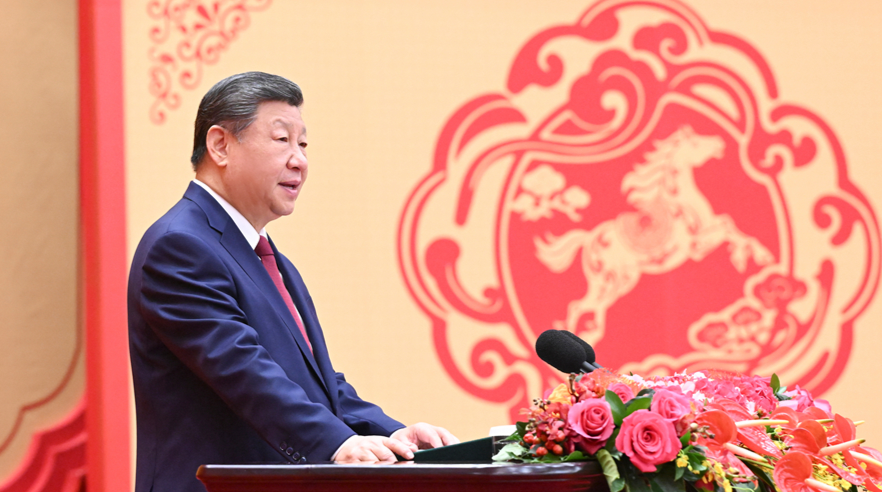 新华社北京2月14日电在二〇二六年春节团拜会上的讲话(2026年2月14日)习近平同志们,朋友们:丙午马年春节即将到来。今天,我们欢聚一堂,辞旧迎新。首先,我代表党中央和国务院,向大家致以节日的美好祝福!向全国各族人民和香港特别行政区同胞、澳门特别行政区同胞、台湾同胞、海外侨胞拜年!即将过去的乙巳蛇年,是很不平凡的一年。面对复杂多变的国际国内形势,我们迎难而上、砥砺前行,推动党和国家事业取得新进展新成效,全年经济社会发展主要目标任务顺利完成,“十四五”圆满收官,我国经济实力、科技实力、国防实力、综合国力跃上新台阶,中国式现代化迈出新的坚实步伐。一年来,我们实施更加积极有为的宏观政策,进一步全面深化改革,扎实推进现代化产业体系建设,我国经济顶压前行、向新向优发展,展现出强大韧性和活力。扎实推进社会主义民主法治建设、文化建设、生态文明建设、国防和军队建设,各项事业互促共进。着力保障和改善民生,社会大局保持稳定。我们胜利召开党的二十届四中全会,擘画了“十五五”发展蓝图。隆重纪念中国人民抗日战争暨世界反法西斯战争胜利80周年,设立台湾光复纪念日,庆祝西藏自治区成立60周年、新疆维吾尔自治区成立70周年,在粤港澳三地联合举办第十五届全国运动会,进一步凝聚起推进中国式现代化的磅礴力量。我们提出全球治理倡议,成功举办上合组织天津峰会、全球妇女峰会,积极推动构建人类命运共同体,为变乱交织的世界注入更多确定性和正能量。我们坚定不移推进全面从严治党,扎实开展深入贯彻中央八项规定精神学习教育,党风廉政建设和反腐败斗争取得显著成效,政治生态和社会风气持续向好。一年来的收获沉甸甸,这是全党全国各族人民共同努力的结果。成就令人鼓舞,奋斗增添信心。只要保持战略定力,一步一个脚印坚定朝前走,一个阶段一个阶段扎实推进,党和国家事业就一定会不断积小胜为大胜,我们的目标就一定能实现。同志们、朋友们!2026年是中国共产党成立105周年,是“十五五”开局之年。我们要坚持以新时代中国特色社会主义思想为指导,深入贯彻党的二十大和二十届历次全会精神,认真落实四中全会部署,坚持稳中求进工作总基调,完整准确全面贯彻新发展理念,加快构建新发展格局,着力推动高质量发展,保持社会和谐稳定,持之以恒推进全面从严治党,努力实现“十五五”良好开局。我们党为人民而生、因人民而兴,一切工作都是为了人民的幸福。我们要始终坚持人民至上,树立和践行正确政绩观,创造经得起实践、人民、历史检验的实绩。同志们、朋友们!在中华文化里,马是刚健雄壮、自强不息的象征,昭示着行稳致远、兴旺发达的前景。丙午马年,希望全国各族人民更加紧密地团结在党中央周围,坚定必胜信心,保持昂扬斗志,在中国式现代化新征程上策马扬鞭、勇往直前,共同开创更加美好的未来。最后,祝大家身体健康、工作顺利、阖家幸福、马年吉祥!谢谢大家!