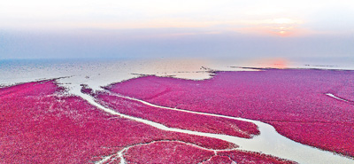 盐地碱蓬是红海滩的“主角”,也是湿地生态的“晴雨表”。每年夏秋时节,生长茂盛的盐地碱蓬将滩涂覆盖,仿佛一块巨大的红色地毯向浅海延伸。作为湿地上的先锋植物,盐地碱蓬能适应盐碱环境,经它改良过的滩涂,才能生长出芦苇、菖蒲。辽河、大辽河、大凌河三条河流从盘锦入海,河海交汇的地理环境造就了这里由海向陆、红滩绿苇的壮观景象。