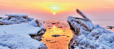 每年12月至第二年2月,盘锦河口冰封,河冰、海冰逐渐向大海延伸,经过潮涨潮落间的相互挤压、层层堆砌,在滩涂上形成高低起伏、千姿百态的冰凌景观。这些冰凌既可为盐地碱蓬的生长提供低盐水分,也是盘锦冰雪旅游的独特资源。