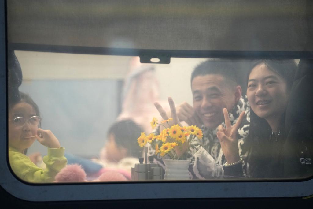 1月26日,在哈尔滨火车站,旅客在列车上向窗外比手势。新华社记者 王建威 摄