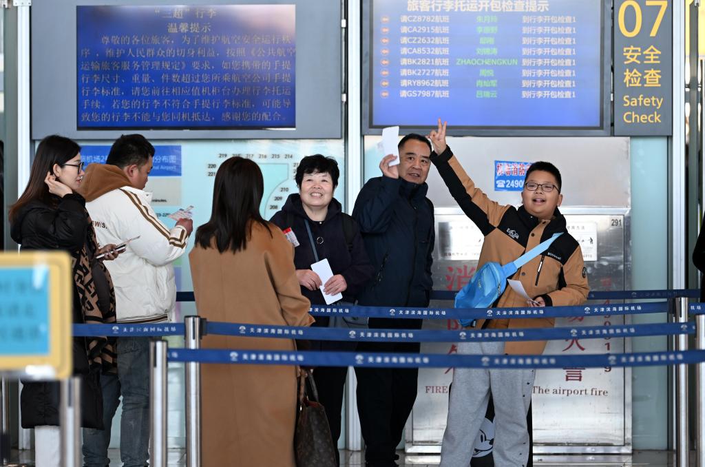 1月26日,在天津滨海国际机场,10岁的赵赵(右一)在姥姥、姥爷的陪同下准备登机去广州,进入安检口前他们挥手向前来送行的家人告别。新华社记者 李然 摄