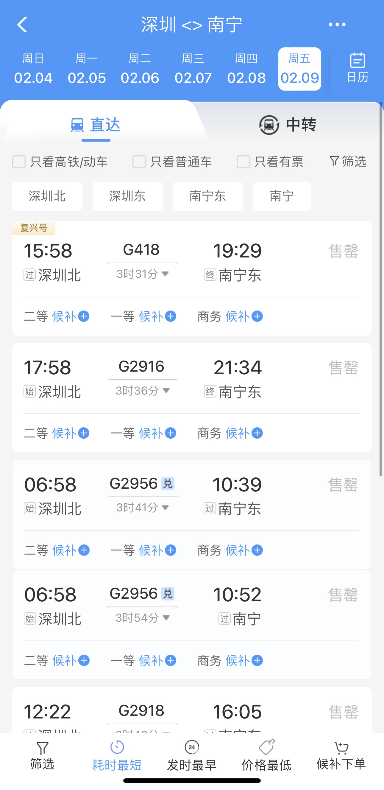 澎湃新闻搜索发现,截至发稿,如2月9日上海-南昌、北京-石家庄、广州-贵阳、深圳-南宁等线路的车票已所剩无几。