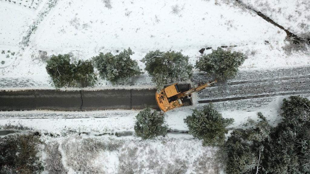 2月5日,挖掘机在湖南省临湘市坦渡镇清理路面积雪与倒伏树枝(无人机照片)。新华社记者陈振海 摄