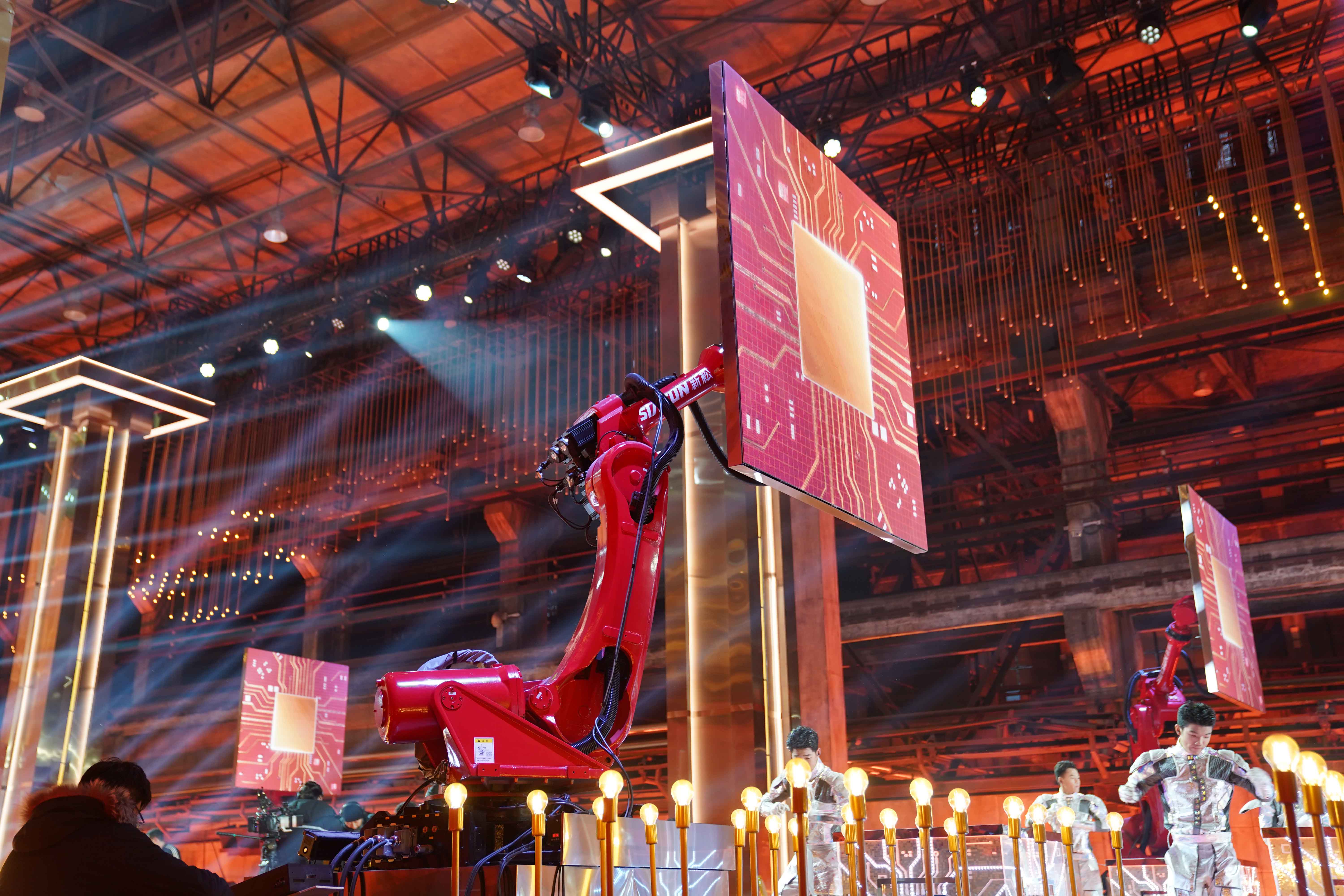 除夕,央视春晚沈阳分会场的表演工业风十足。其中有8名身份特殊的“演员”随着现场音乐灵活地变换身姿,和数百名专业演职人员联袂表演,时而专业地“调度”灯光,时而灵巧地“旋转”手绢,时而轻盈地“舞动”雪花,时而自豪地“托举”芯片……