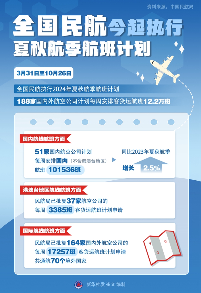 新华社北京3月31日电(记者王聿昊)3月31日至10月26日,全国民航执行2024年夏秋航季航班计划,188家国内外航空公司计划每周安排客货运航班12.2万班,民航运输呈现稳步增长。