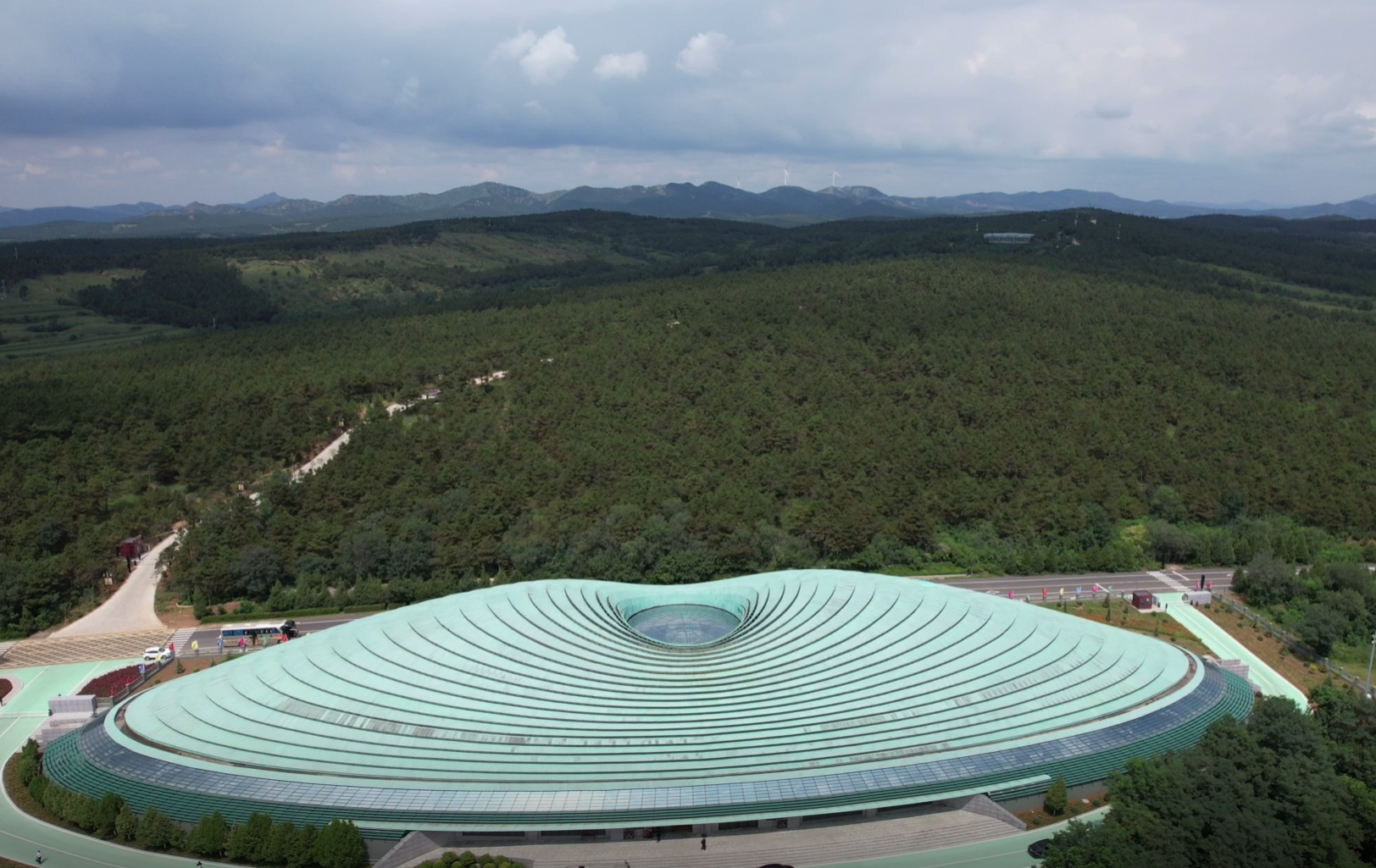 积石冢展览馆鸟瞰,远处建筑为牛河梁女神庙展览馆(央广网记者 李子平 摄)