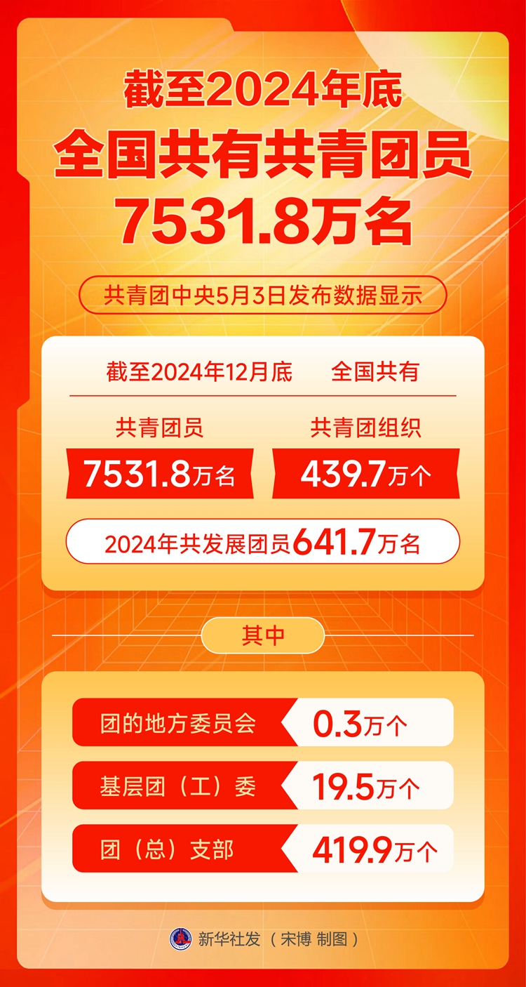 新华社北京5月3日电 共青团中央3日发布数据显示,截至2024年12月底,全国共有共青团员7531.8万名,共青团组织439.7万个。2024年共发展团员641.7万名。