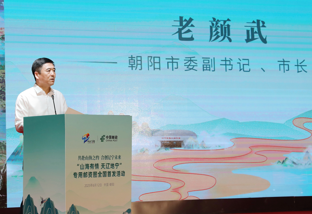 老颜武在致辞中对各位领导和嘉宾的到来表示欢迎,向中国邮政集团长期以来对朝阳经济社会发展给予的关心支持表示感谢。他说,一直以来,朝阳市与中国邮政集团精诚合作、共谋发展,尤其是“红山文化玉器”“中国恐龙”等特种邮票的发行传播,让更多人了解朝阳、来到朝阳、爱上朝阳。“山海有情 天辽地宁”专用邮资图在朝阳首发,玉猪龙、恐龙、南北塔、慕容街等朝阳元素精彩亮相,必将进一步擦亮“朝阳花开 欢迎你来”“宝藏之城 神秘朝阳”城市文化名片,为朝阳文体旅融合发展注入全新动能。朝阳市将深入贯彻落实习近平总书记在辽宁考察时的重要讲话和重要指示精神,按照省委、省政府工作部署,持续深化与邮政系统的战略合作,共同打造邮地合作的新模式新场景新业态,促进邮政情怀与朝阳文化的深度融合,为辽宁打造高品质文体旅融合发展示范地作出更大贡献。