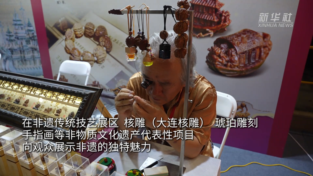 展览共分民间工艺美术精品、青年文创艺术、非遗传统技艺、工业设计职工技能大赛四个板块。在非遗传统技艺展区,核雕(大连核雕)、琥珀雕刻、手指画等非物质文化遗产代表性项目,向观众展示非遗的独特魅力。