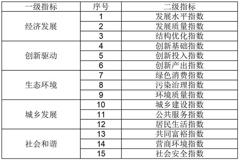 中小城市综合实力指数下设经济发展、创新驱动、生态环境、城乡发展、社会和谐5个一级指标,发展水平、创新基础、绿色消费、城乡建设、共同富裕等15个二级指标(见表2)。