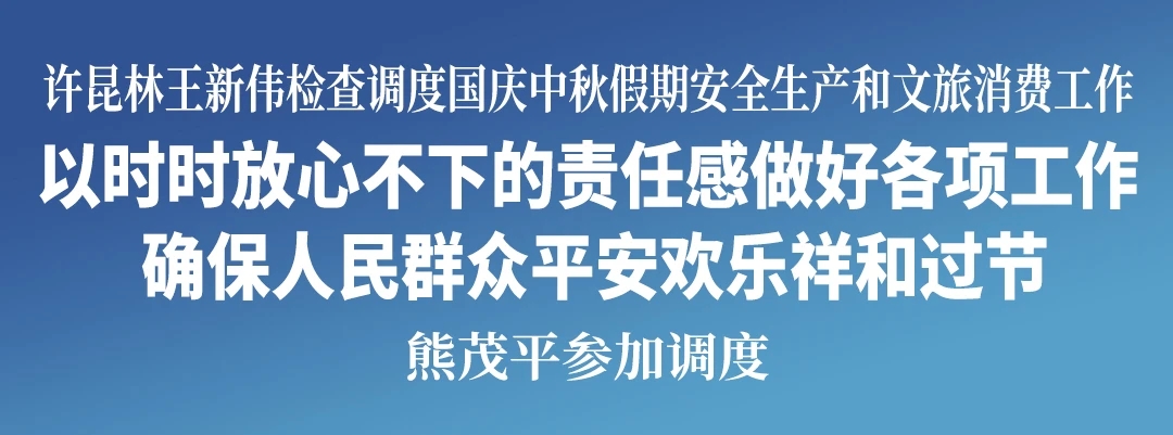 许昆林指出,今年国庆中秋双节叠加,假期时间较长、客流量大,活动密集、风险点多,要提高政治站位,树牢底线思维、极限思维,全力以赴做好稳生产、促消费、保安全各项工作。要压紧压实各方责任,各级党委政府对节日期间各方面情况实行日调度,压实属地管理责任、部门监管责任、企业主体责任,严格执行值班值守制度,把工作任务落实到人头、落实到岗位、落实到“神经末梢”。要扎实做好安全稳定工作,进一步拧紧安全责任链条、落细落实防范措施,紧盯重点领域重点部位重点环节,全力抓好道路交通安全,坚决防范出现长时间、大面积拥堵,抓实消防安全和渔业安全生产,强化社会治安整体防控,坚决防范遏制重特大事故发生。要保障文旅市场平稳有序,完善迎峰措施,做好各项预案,加大市场监管力度,做好精细化、人性化服务,抓住有利契机,打造更多新场景、新体验、新热点,持续提升文旅市场热度。要安排好“两节”期间群众生活,格外重视关心困难群体,抓好物资保供稳价,丰富市场供应和服务供给,推动消费市场提质扩容升级。要提早安排好四季度工作,确保“十四五”圆满收官,科学谋划好“十五五”发展,为明年实现良好开局奠定扎实基础。