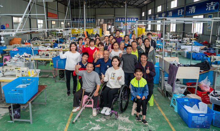 2020年10月13日,在湖南省邵阳市城步县湖南七七科技股份有限公司生产车间,杨淑亭(前排中)与工友合影。新华社记者 才扬 摄