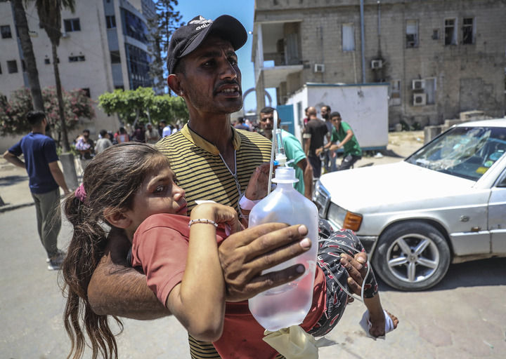 2025年7月13日,在加沙城一所医院,一名男子怀抱在以军空袭中受伤的女孩。新华社发(马哈茂德·扎基摄)