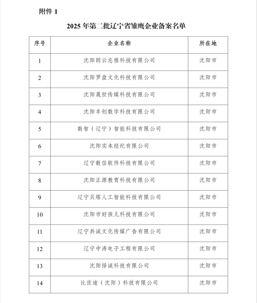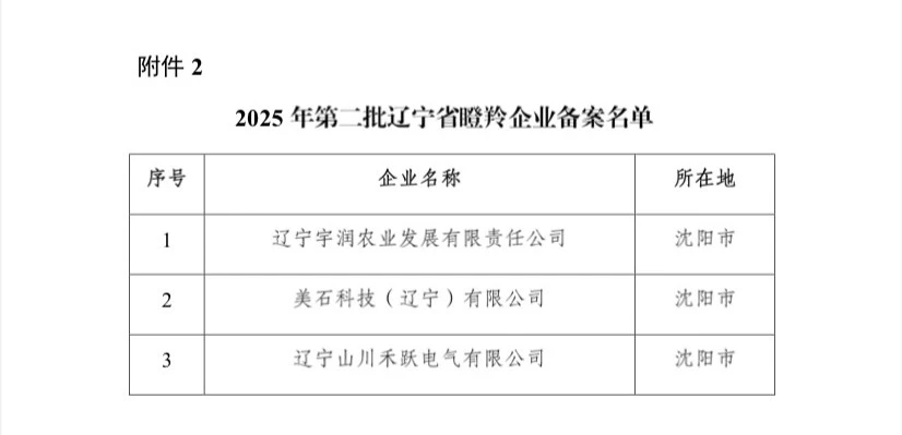 根据《辽宁省雏鹰、瞪羚、独角兽企业评价办法》,辽宁省科技厅组织开展了2025年第二批辽宁省雏鹰瞪羚独角兽企业备案工作。