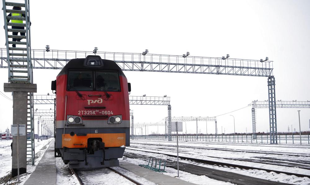 12月6日,一辆即将开往中国的俄罗斯货运列车停靠在俄罗斯下列宁斯阔耶铁路口岸。新华社记者 刘恺 摄