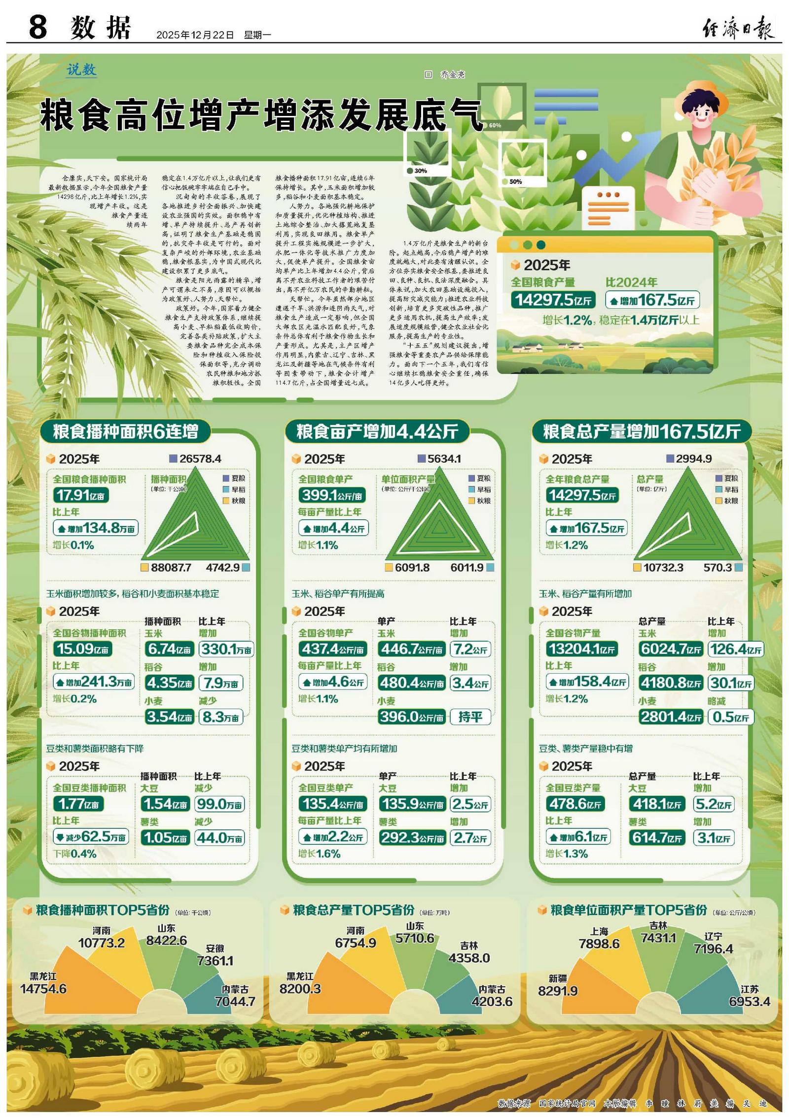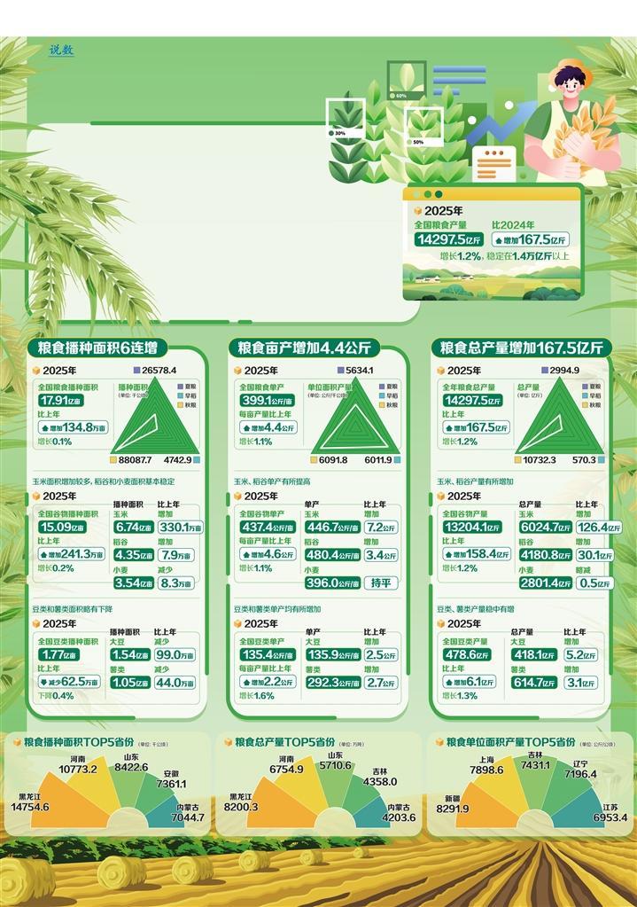 仓廪实,天下安。国家统计局最新数据显示,今年全国粮食产量14298亿斤,比上年增长1.2%,实现增产丰收。这是粮食产量连续两年稳定在1.4万亿斤以上,让我们更有信心把饭碗牢牢端在自己手中。
