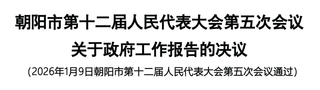 朝阳市第十二届人民代表大会第五次会议听取和审议了市长老颜武所作的《政府工作报告》。会议高度评价“十四五”时期我市经济社会发展取得的重大成就,充分肯定市人民政府2025年的工作,同意报告提出的“十五五”时期主要目标任务和2026年工作安排,决定批准这个报告。