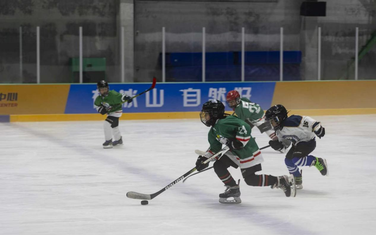 图为大连冰熊冰上运动中心,青少年们进行冰球训练