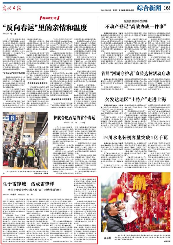 2月2日,由中共辽宁省委宣传部、辽宁省精神文明建设办公室主办的2026年“辽宁时代楷模”发布会在沈阳举行。辽宁中医药大学2022级中西医临床医学专业本科生金城龙被追授“辽宁时代楷模”称号,以表彰其在冰窟救人中英勇献身的壮举。