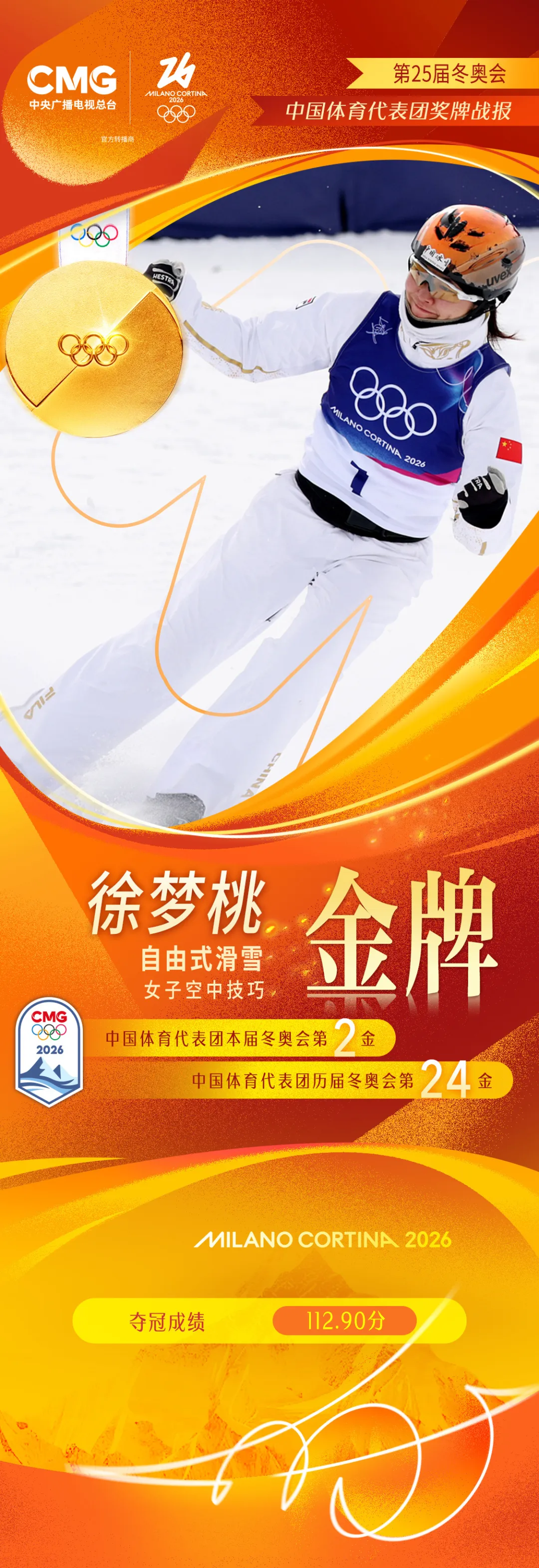 北京时间2月18日,在米兰-科尔蒂纳冬奥会自由式滑雪女子空中技巧决赛中,中国选手徐梦桃夺得金牌。这也是中国体育代表团在本届冬奥会收获的第二枚金牌。中国选手邵琪夺得铜牌。