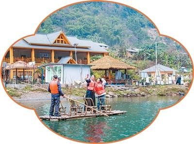 云南昭通市绥江县南岸村,游客乘竹筏游览山水美景。 曾三东摄