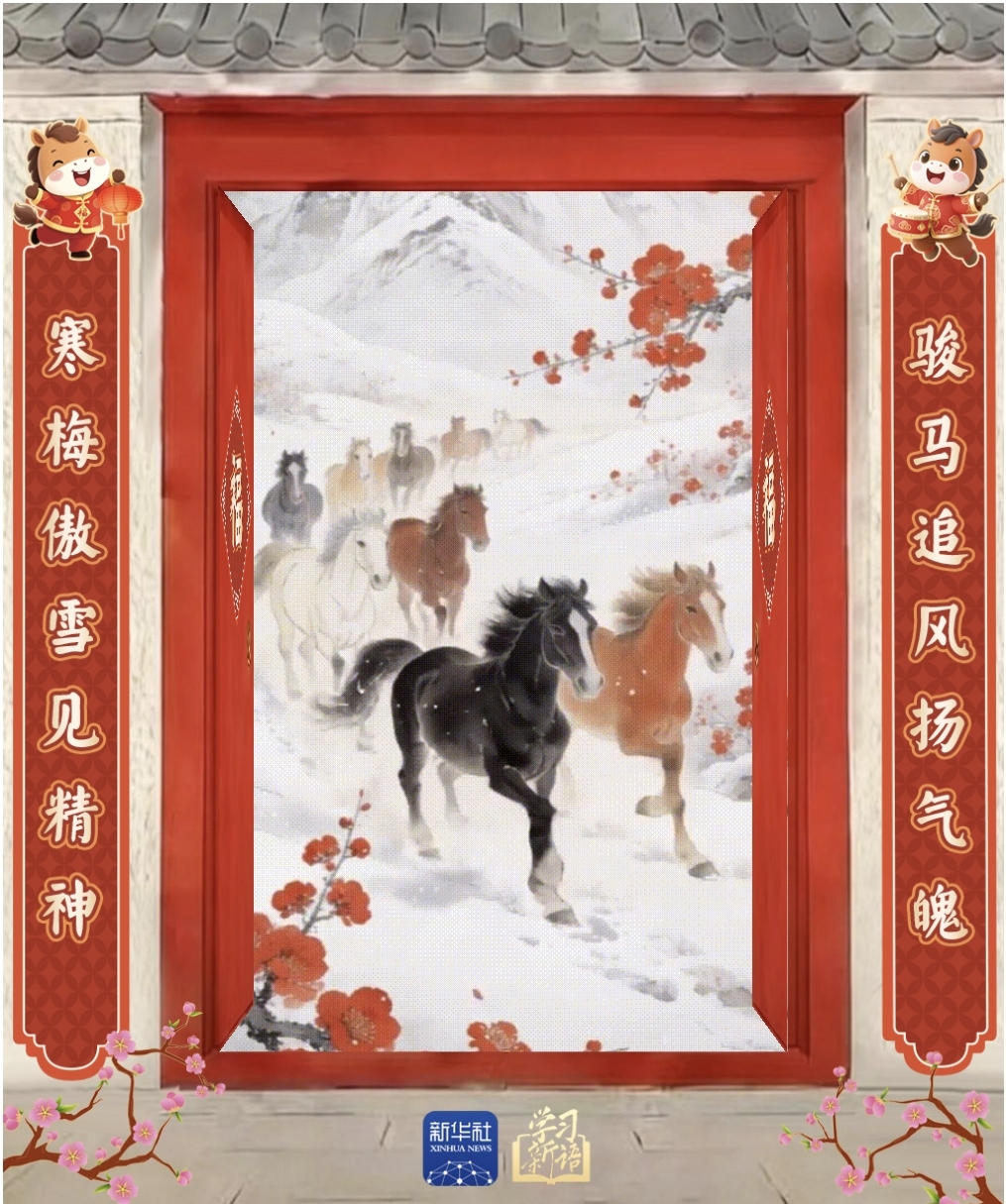 时间回到2014年。上一个农历马年春节前夕,习近平总书记同党外人士共迎新春时,念了两副报纸上刊登的春联送给大家,一副是“骏马追风扬气魄,寒梅傲雪见精神”,另一副是“昂首扬鬃,骏马舞东风,追求梦想;斗寒傲雪,红梅开大地,实现复兴”。